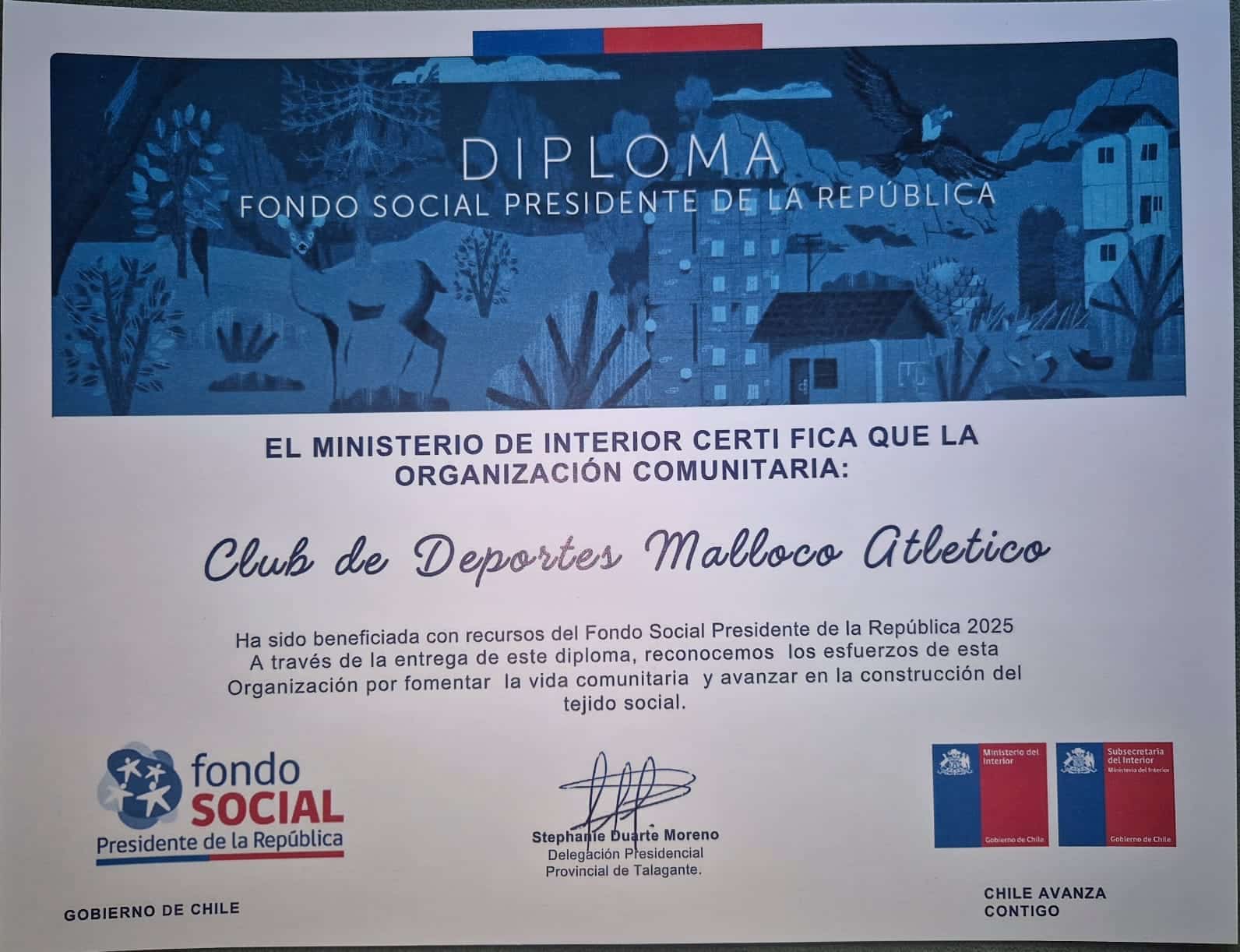 Siguen las buenas noticias para nuestra institución, ya que hace algunos unos días, nuestro presidente Ricardo Núñez participó de la entrega de diploma y traspaso de recursos del Fondo Presidente de la República 2025, que permitirá la adquisición de un refrigerador y un computador moderno para fortalecer nuestra gestión administrativa.